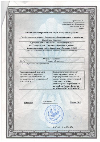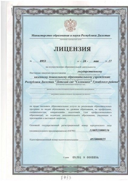 | Полное наименование образовательной организации* | ГОСУДАРСТВЕННОЕ КАЗЕННОЕ ДОШКОЛЬНОЕ ОБРАЗОВАТЕЛЬНОЕ УЧРЕЖДЕНИЕ РЕСПУБЛИКИ ДАГЕСТАН "ДЕТСКИЙ САД "СОЛНЫШКО" ГУНИБСКОГО РАЙОНА" |